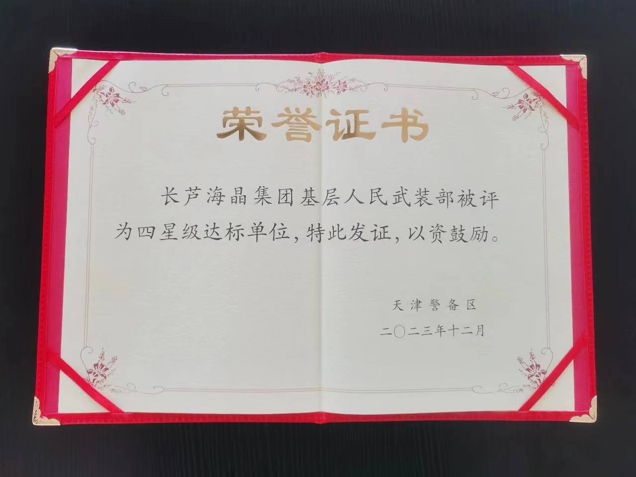 近日,公司人民武裝部在中國人民解放軍天津警備區組織的基層人民武裝部達標建設考評工作中,獲評“四星級基層武裝部”榮譽稱號。